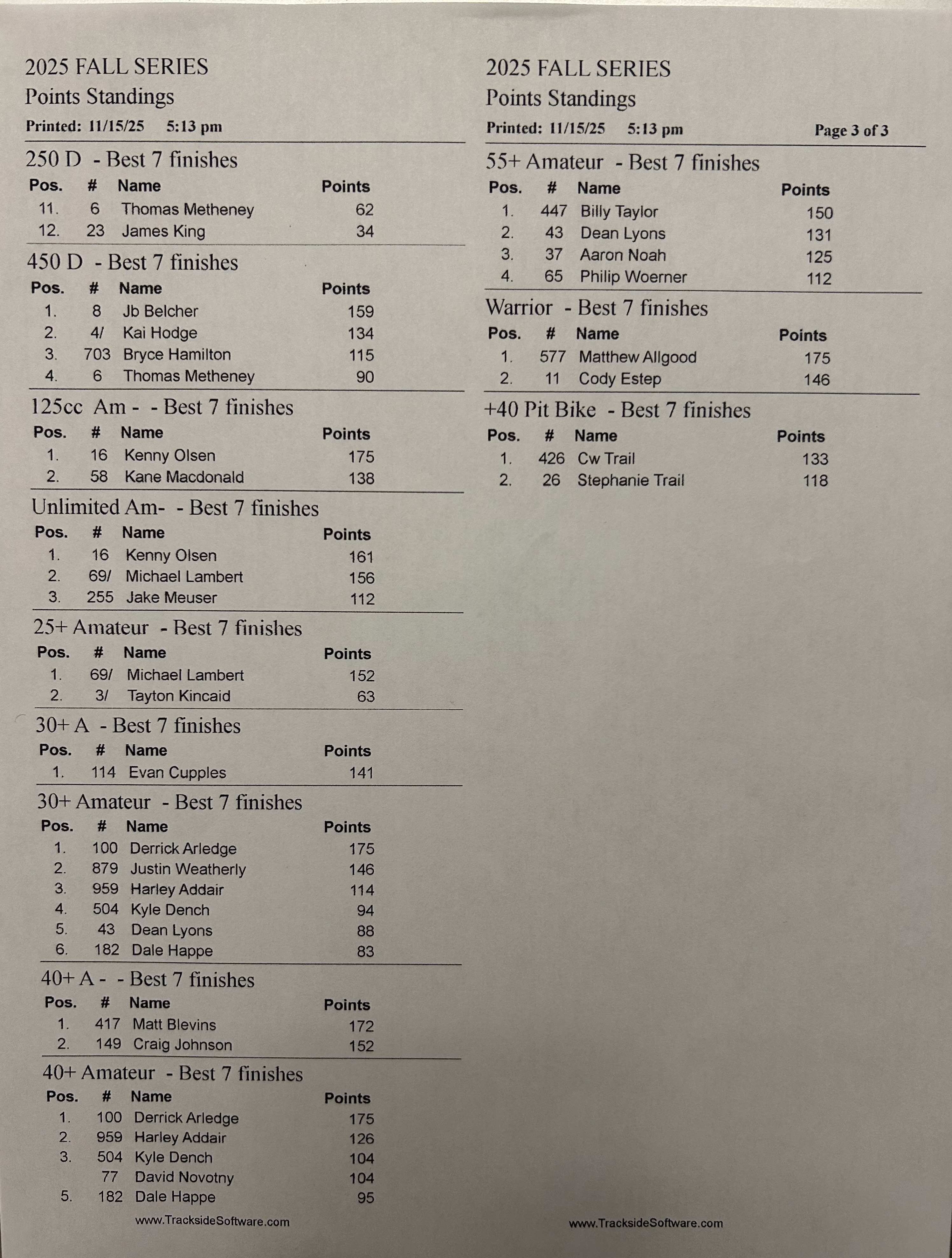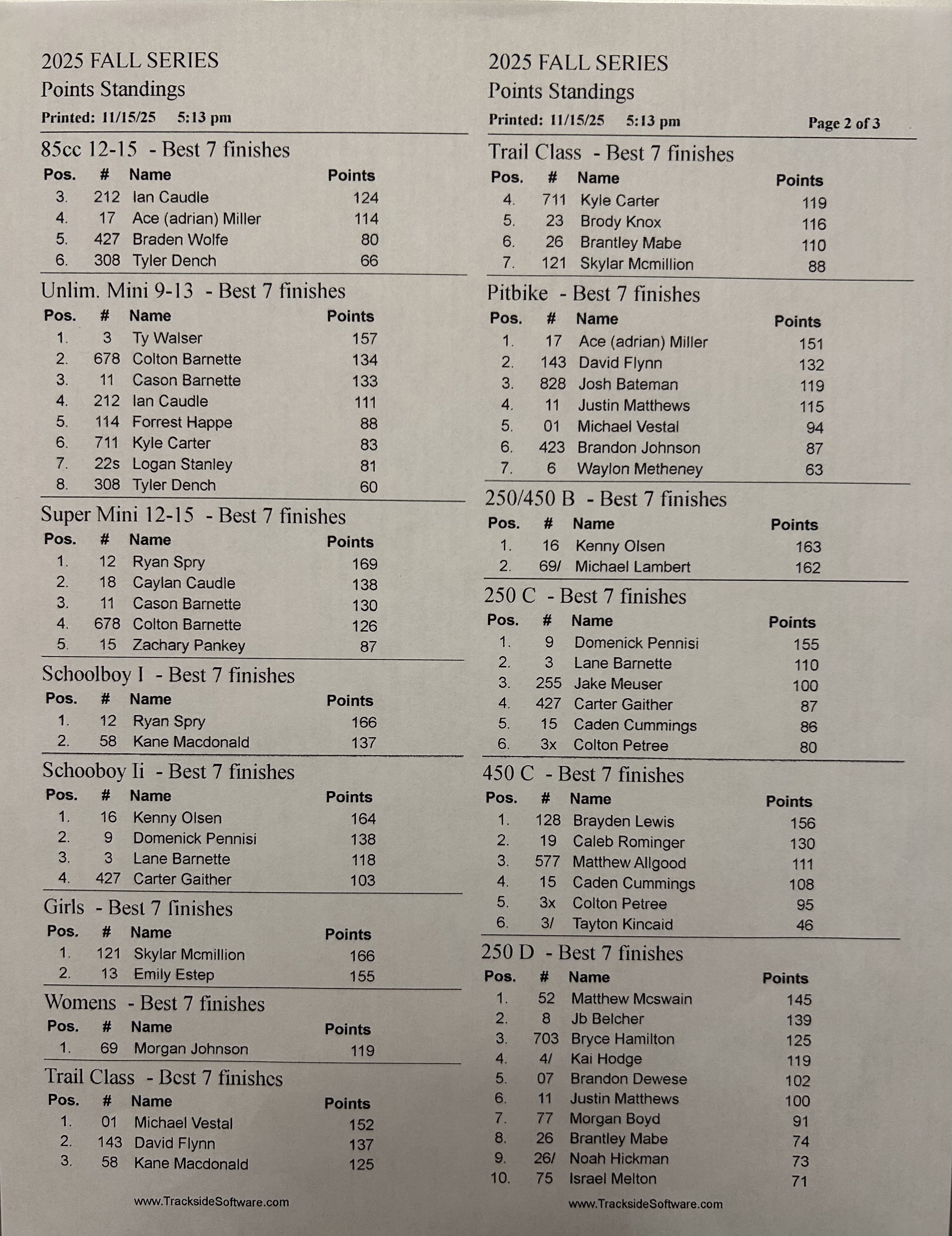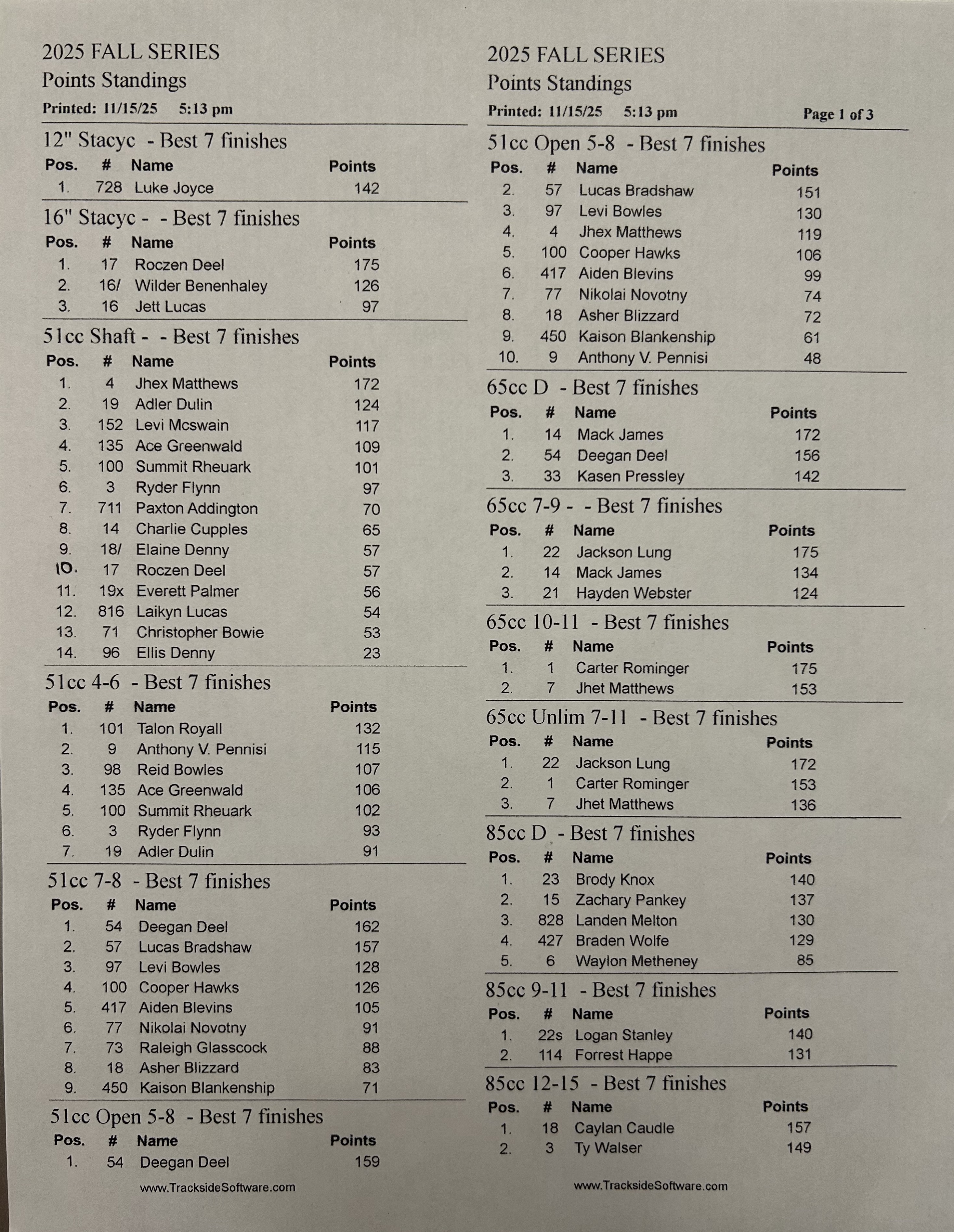 PLEASE NOTE THAT YOU HAD TO RUN 9 OF THE 12 ROUNDS TO QUALIFY FOR THE END OF SERIES AWARDS & WE COUNT THE BEST 10 RACES. THE FIRST RACE COUNTED AS R1 AND R2 SINCE IT WAS A DOUBLE POINTS RACE. THE POINTS LISTED ON THE FINAL SERIES POINTS FILE ARE THE POINTS WHEN COUNTING THE BEST 10 RACES. WHEN THERE IS A TIE IN POINTS, WE GO BY WHO RAN THE MOST RACES.